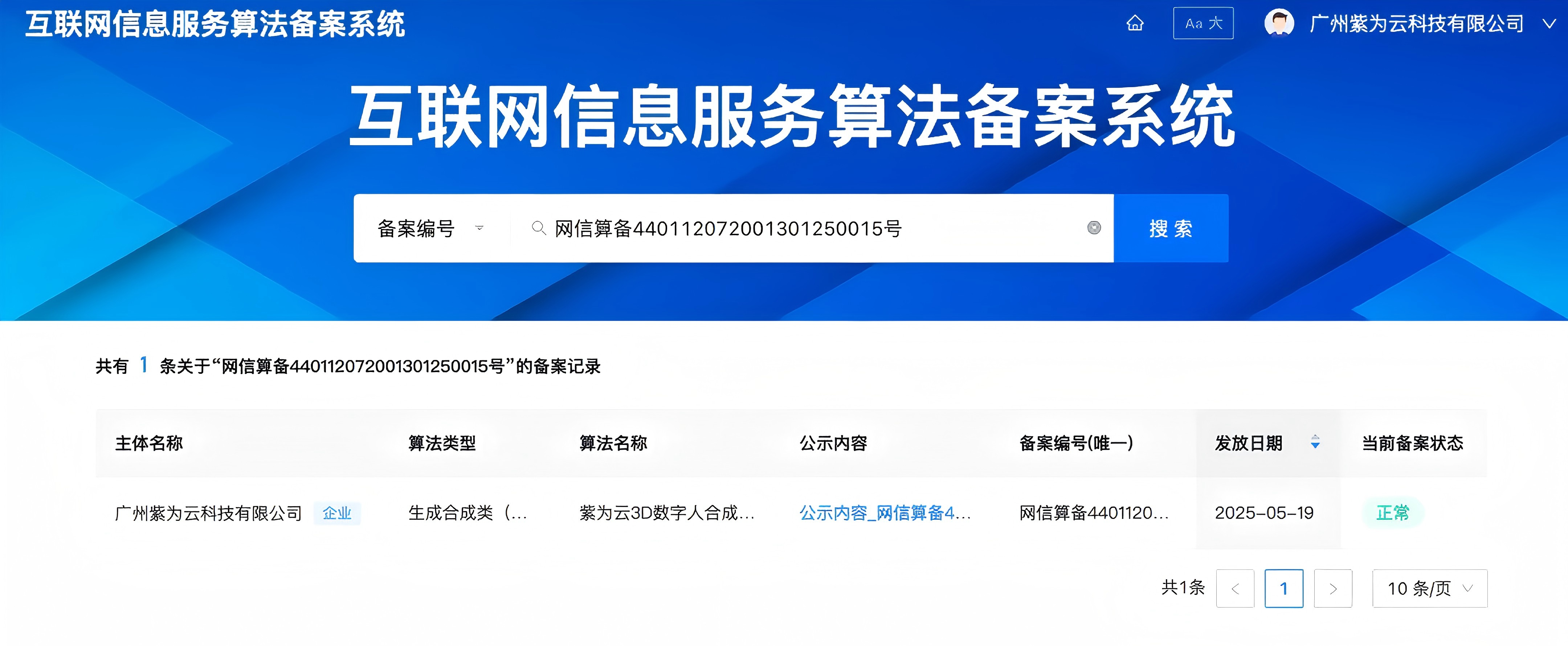 2025年5月19日,国家互联网信息办公室发布第十一批境内深度合成服务算法备案公告,紫为云自主研发的3D数字人合成算法顺利通过备案。